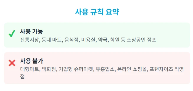 - 온라인 사용 불가: 대부분의 민생회복 소비쿠폰은 오프라인 소상공인 매장에서만 사용 가능하며, 온라인 쇼핑몰, 대형마트, 백화점 등에서는 사용이 제한됩니다.